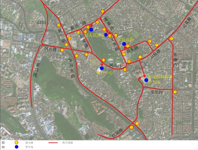 G105(南)来车: G105-兴顺路-观绿路-龙盘路-P3、P4、P6停车场;
