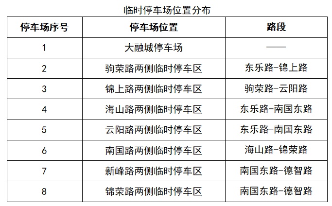 (2)国庆期间新增临时停车场,开放大融城,以及驹荣路、锦上路、海山路、云阳路、南国东路、新峰路、锦荣路等部分道路两侧供车辆临时停放,共约提供停车泊位约2660个。