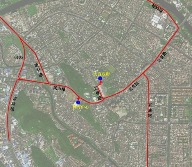 G105→凤山路(体育中心)→文秀路→县东路→大良政府;