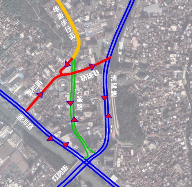 (3)节假日期间,果栏路、桥珠巷调整为西往东单行道路,围绕果栏路-桥珠巷-清晖路-鉴海路形成顺时针单向循环交通组织,碧鉴路保留双向通行。