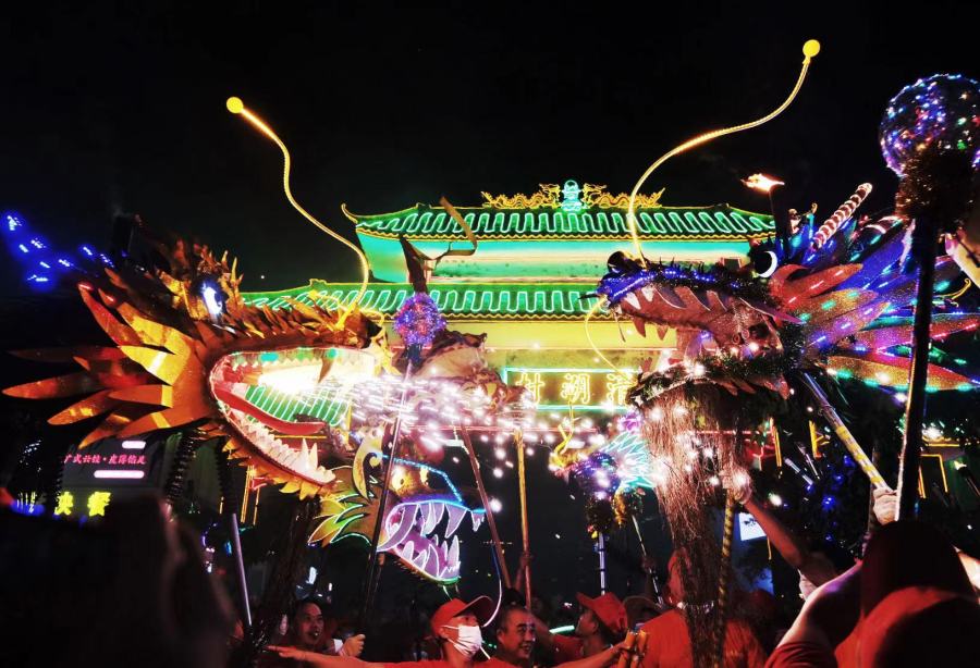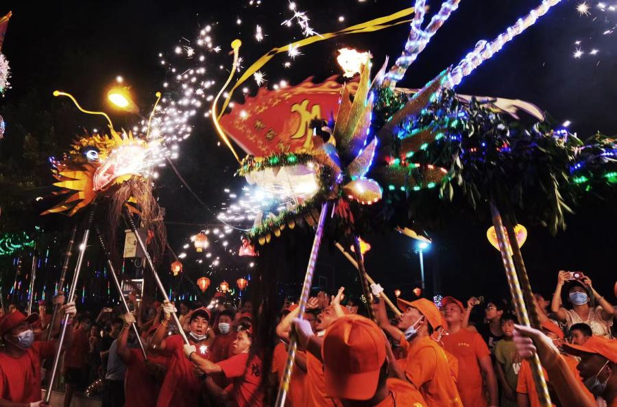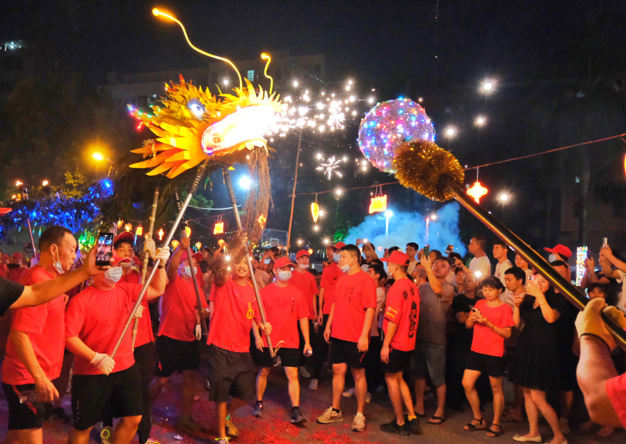 “舞龙头,无忧愁;摸龙须,步步高;穿龙底,醒目仔;睇火龙,唔会穷......”9月29日中秋之夜,在广州市白云区均禾街清湖村内,人声鼎沸,锣鼓喧天,四条十几米长的火龙追火逐珠,翻腾炫舞,火花耀眼,气势恢宏,吸引了大批居民群众争睹盛况。村民们通过舞火龙,庆祝中秋佳节,祈祷风调雨顺、国泰民安、五谷丰登。