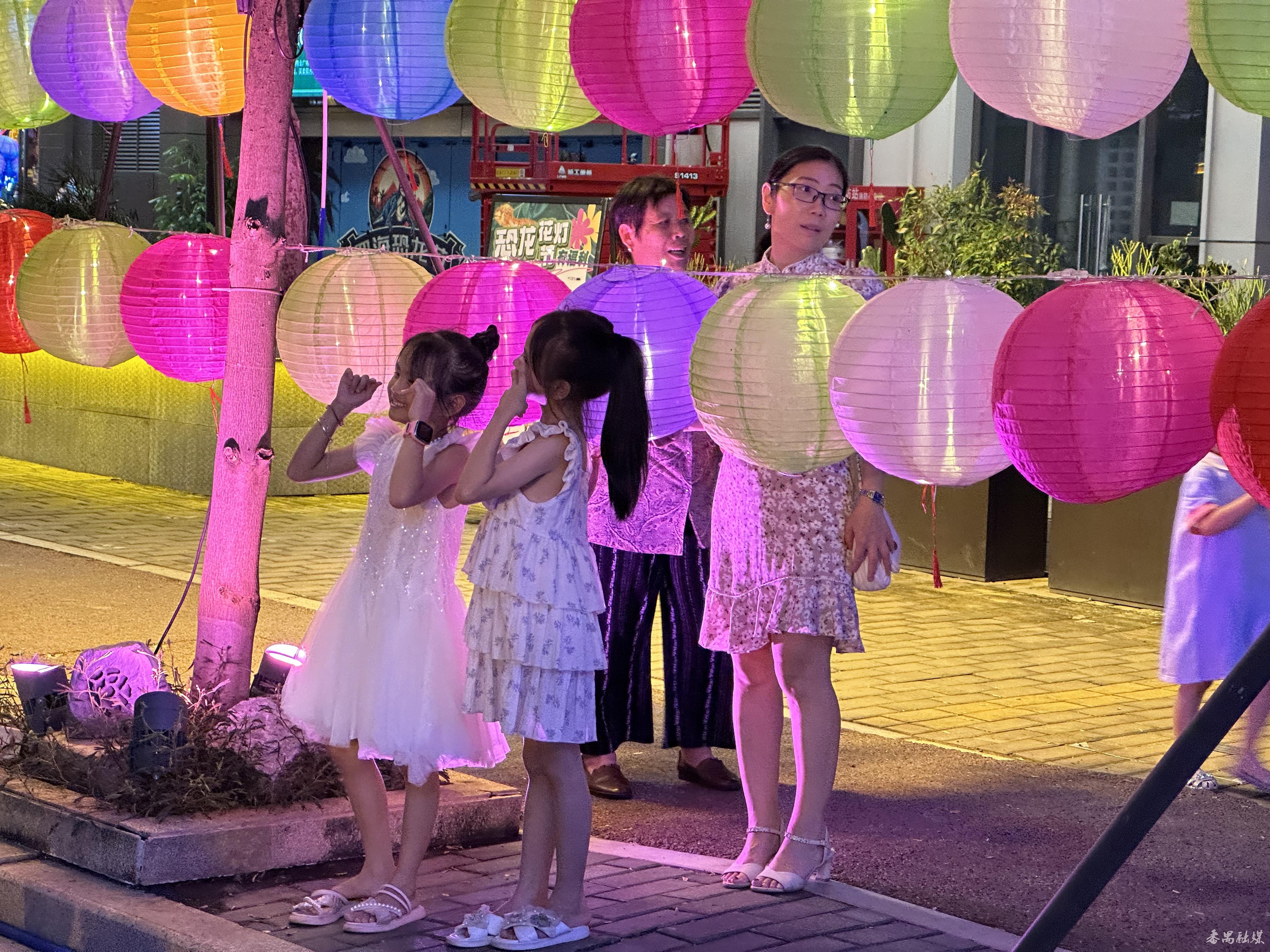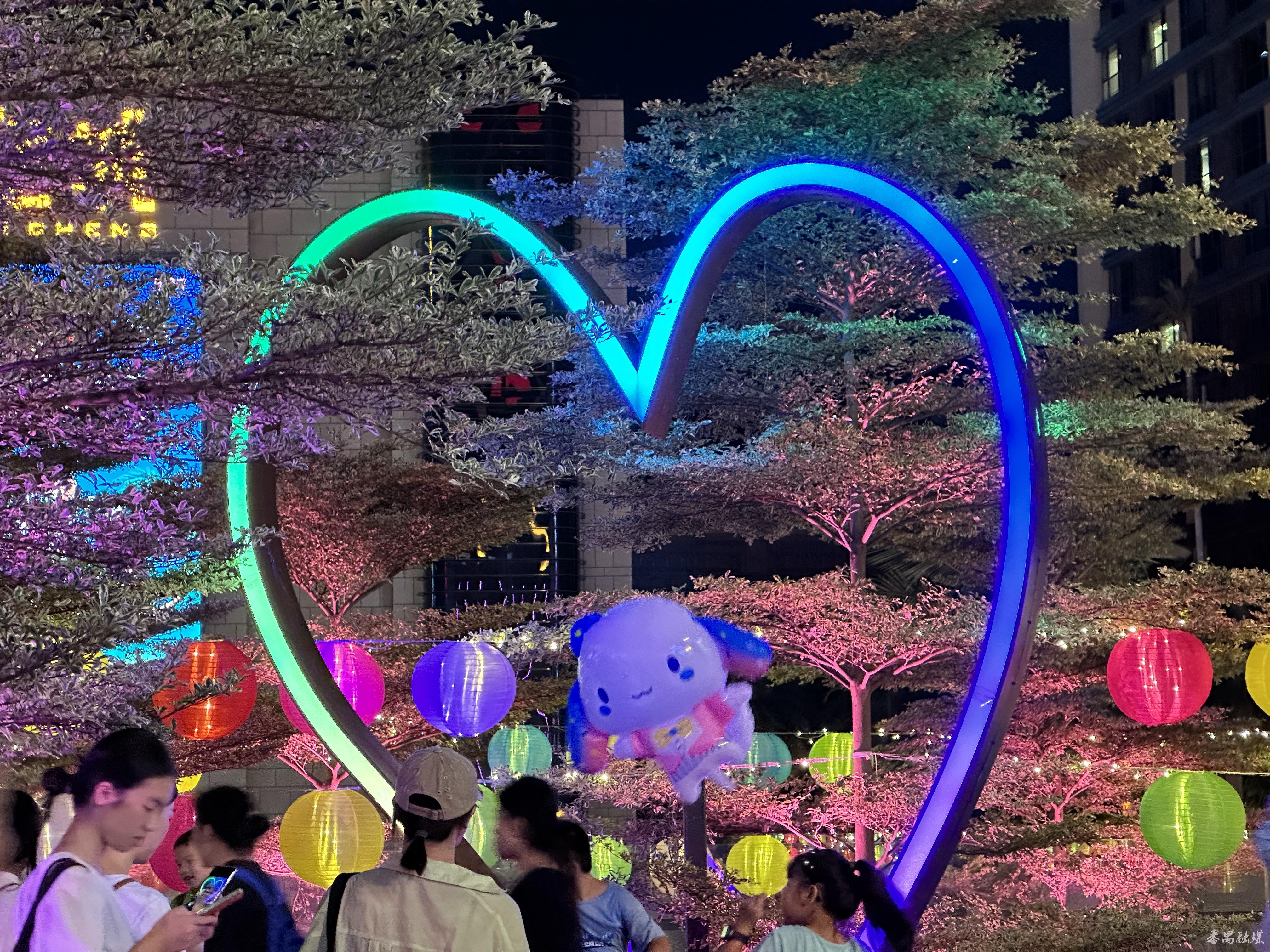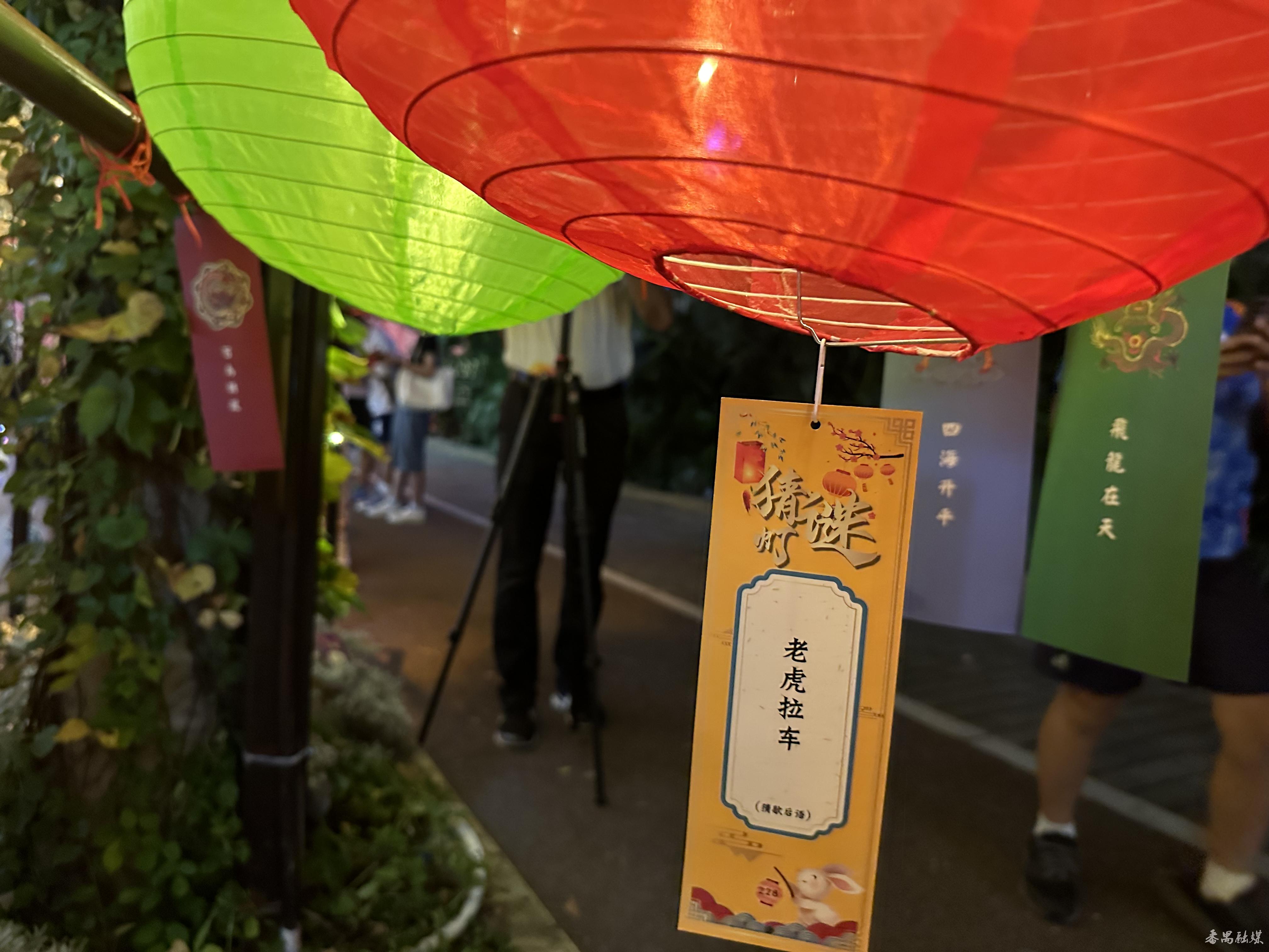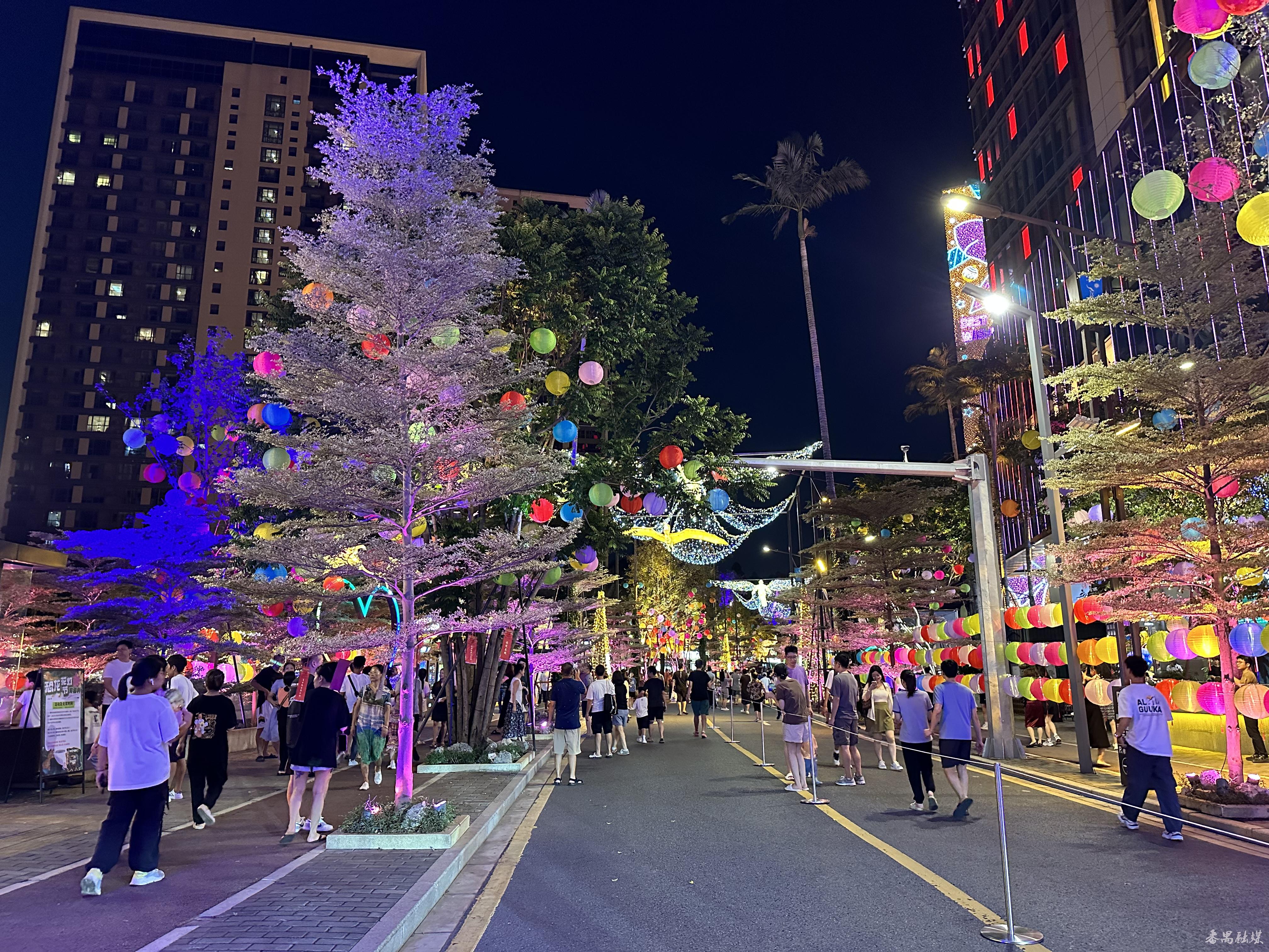 9月29日,记者来到番禺四海城,看到在表心道的道路两旁,行道树上挂满了五彩靓丽的花灯,树边一排排的灯谜挂在灯笼下,引来不少游客驻足拍照、游玩。