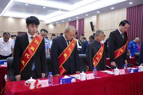 烈士遗属和现场人员为烈士默哀。
