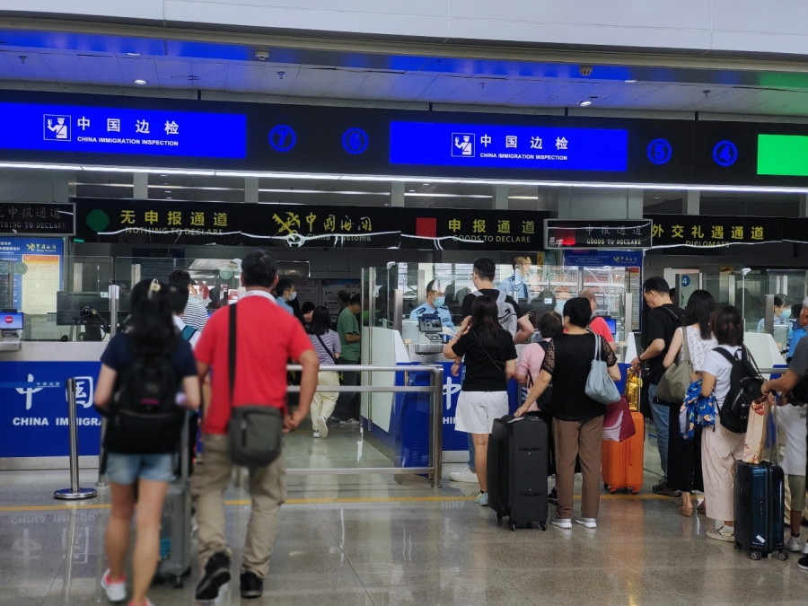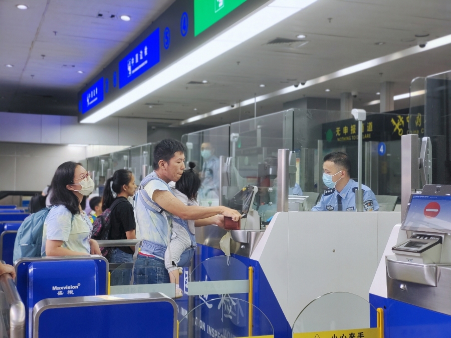 “双节”假期,南沙客运港边检出入境现场忙碌而有序。坚守岗位的南沙边检站民警规范文明执勤,努力营造祥和、安全、便捷的口岸通关环境。