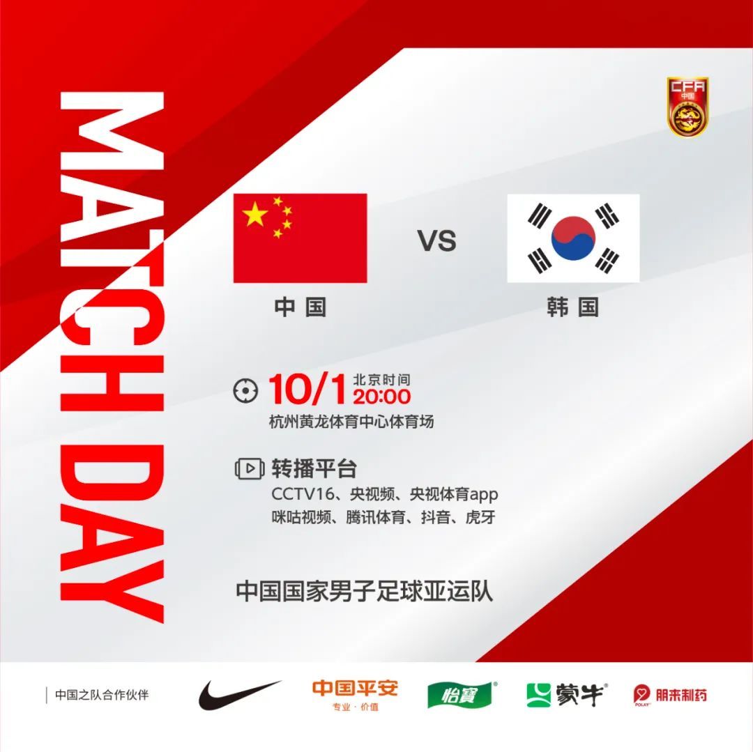 10月1日20:00,中国国家男子足球亚运队将继续坐镇黄龙体育中心体育场,在亚运会男足1/4决赛中对阵韩国队。CCTV16奥林匹克频道、央视频、央视体育APP、咪咕视频、腾讯体育、抖音、虎牙等平台将直播比赛,让我们一起为中国队加油!