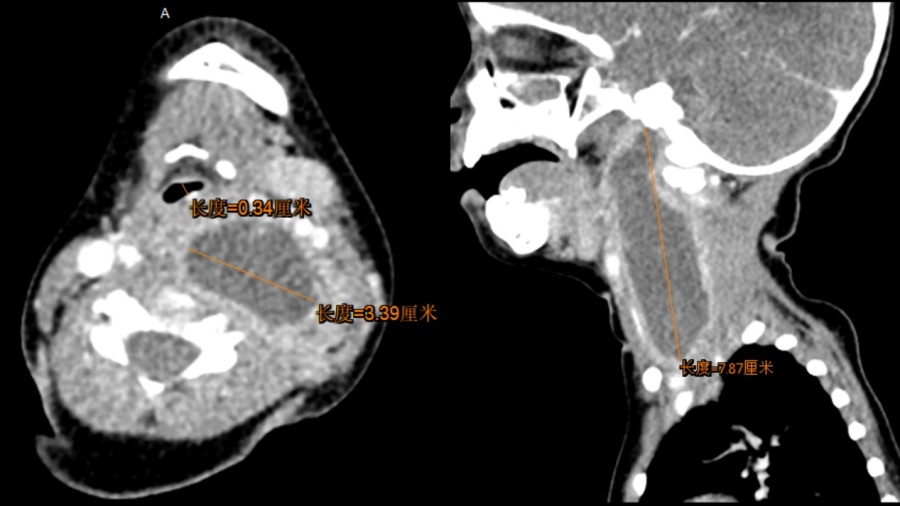 接到急诊前台来电后,医院耳鼻喉科当班二值和住院总医师立即到场查看患儿情况。经过初步评估,发现这是一个幼儿巨大颈深部脓肿,脓肿位置很深,毗邻颈部大血管神经,上至颅底,下至上纵隔,已经压迫气道,颈段气管受压移位,最窄的地方只有3毫米的空间!小希病情危重,随时有气道梗阻、窒息、大出血、感染蔓延危及生命的危险,必须创造条件尽快进行脓肿引流。
