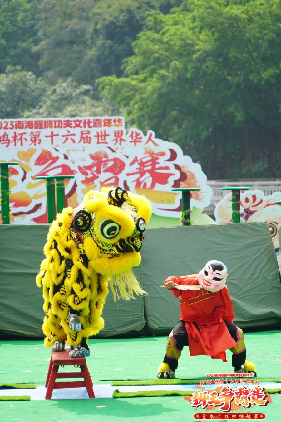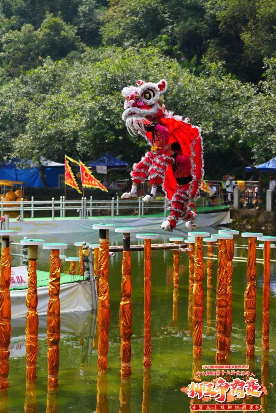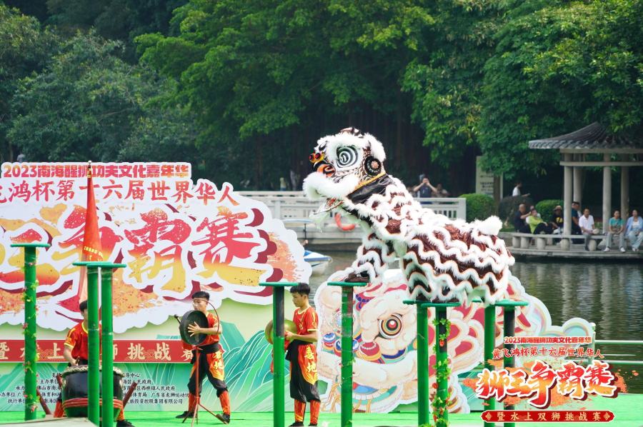 10月1日至2日,2023南海醒狮功夫文化嘉年华系列活动之一——2023“黄飞鸿杯”第十六届世界华人狮王争霸赛暨水上双狮挑战赛在西樵山天湖公园开擂。今年赛事设有高桩南狮、水上双狮和传统南狮等竞赛项目,海内外20支华人醒狮队伍比拼超凡的南狮技艺,争夺新一届世界华人狮王座。同时,比赛穿插创新醒狮表演,将传统醒狮套路串联岭南文化元素,使赛事更具观赏性和趣味性。