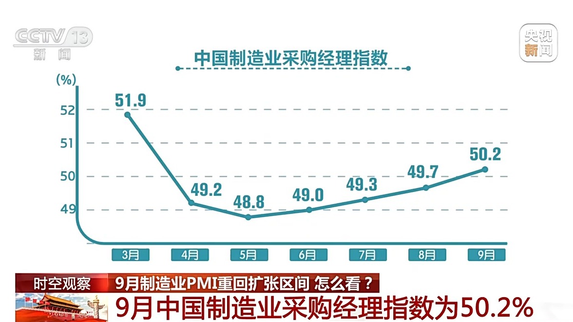 PMI也就是采购经理指数,有宏观经济变化的“晴雨表”之称,它是国际上通行的宏观经济先行监测和预警指标,通常以50%作为经济强弱的临界值,高于50%,反映经济扩张;低于50%,则反映经济收缩。9月份制造业PMI重回扩张区间,说明整个中国经济的发展已经开始由恢复的阶段,进入到一个增长的阶段。而在其中,重点行业像装备制造业、高技术制造业和消费品行业采购经理指数分别为50.6%、50.1%和51.3%,比上月上升0.6、0.7和0.3个百分点,均位于扩张区间。