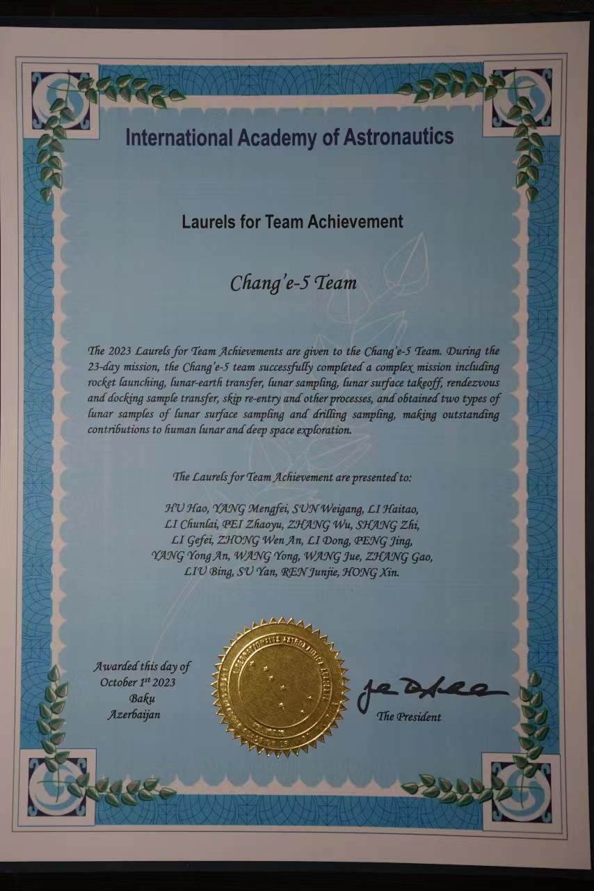 “劳伦斯团队奖”设立于2001年,是国际宇航科学院(IAA)每年颁发的两大奖项之一,是国际宇航科学院的最高团队荣誉,旨在表彰在宇航领域取得突出成绩的宇航项目团队。嫦娥五号在技术创新、科学发现、国际合作三方面取得的突出成就,赢得了国际同行的高度认可。