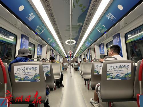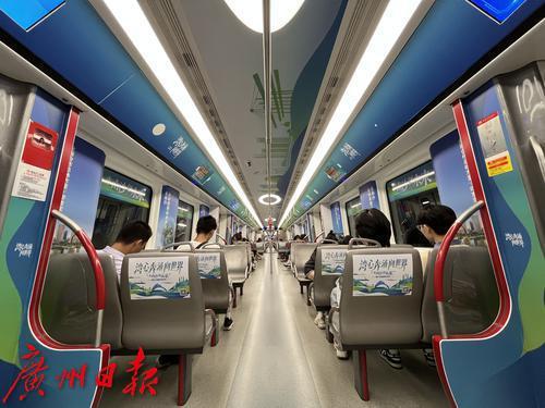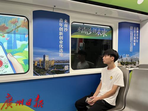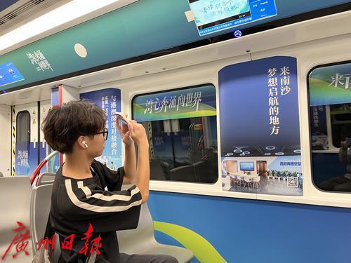 记者在地铁横沥站看到,南沙专列身披南沙城市LOGO主形象色蓝色和绿色,不仅展示了南沙的各类地标,还通过可视化设计创新传播南沙的城市发展历程、建设成就和未来蓝图。