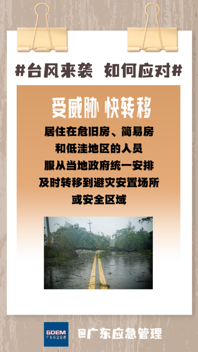 广东省防汛防旱防风总指挥部要求各地各部门要深入学习贯彻习近平总书记关于防汛救灾工作重要指示精神,认真落实省委省政府工作部署,强化组织领导,层层压实责任,加强预测预报预警,及时启动应急响应,按照防台风“六个百分百”要求,扎实做好台风防御各项工作,切实把保障人民群众生命财产安全放在第一位落到实处。
