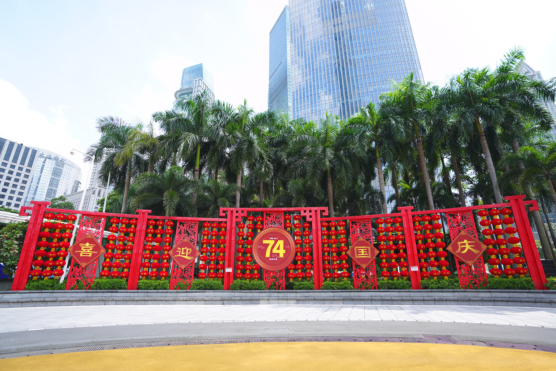 在喷泉广场两边,由800多个社会主义核心价值观主题的红灯笼组成灯笼墙,鲜艳的中国红为国庆节更增添喜庆;海心沙公园入口处的“我爱广州”网红灯光装置,花坛底部鲜花环绕“祝福祖国”,祝愿祖国繁荣昌盛。