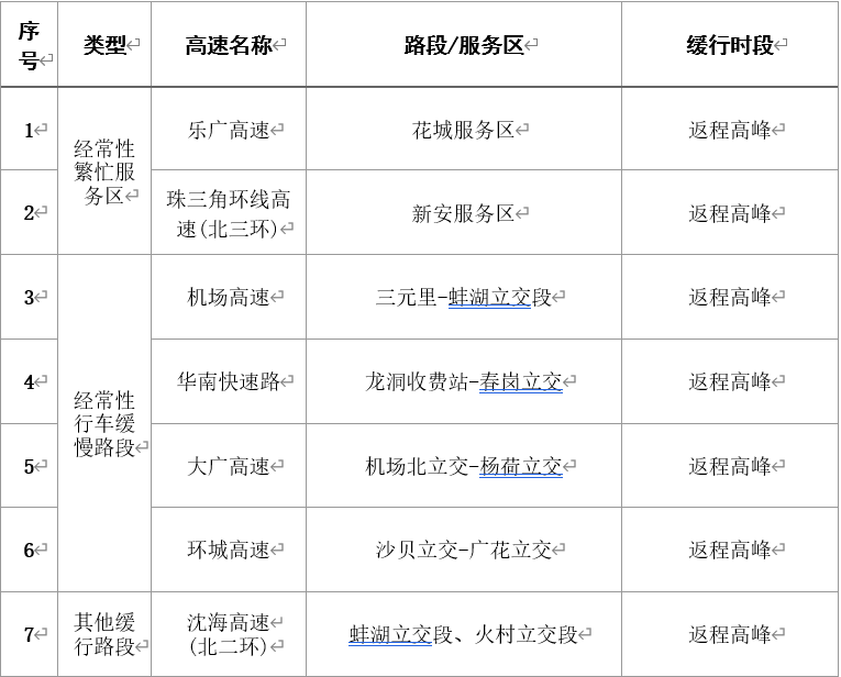 返程高峰时,北三环(机场北立交-杨荷立交)等瓶颈路段拥堵将较为严重。同时,广佛高速沙贝服务区、横沙服务区,京港澳高速瓦窑岗服务区、广河高速正果服务区、大广高速从化服务区、乐广高速花城服务区、沈海高速(北二环)火村服务区以及珠三角环线高速(北三环)新安服务区等高速服务区预计将会出现车流量密集,车辆进入服务区排队时间较长,可能出现车流倒灌影响主线通行。
