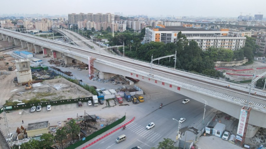据中铁二十五局项目轨道施工负责人蓝茂东介绍,铺轨作业采用换铺法进行,即先在线路上铺设25米工具轨,再通过人机协作换铺成500米长轨,后续开展焊接、应力放散、无缝线路锁定、轨道整理等工序,经轨道精捣精调达到验收标准后,进入联调联试。