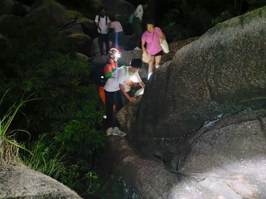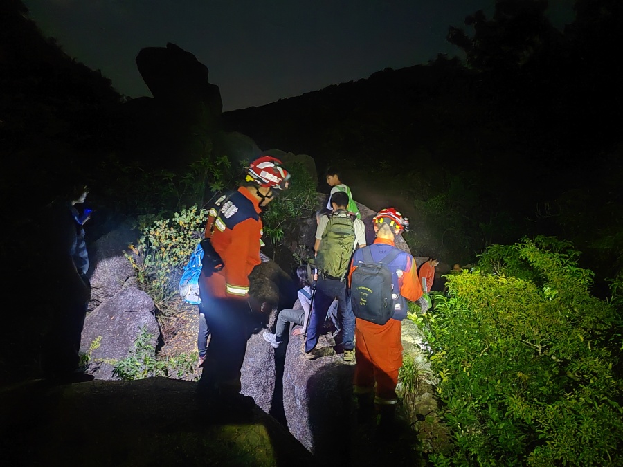 4名消防救援人员马上携带救生器材跟随向导前往救援,其余人员成立紧急救助小组,经过3个小时的紧张搜救,9名被困人员被全部找到(七名大人,两名小孩)。消防救援人员确认被困人员无人员受伤后,陆续将游客转移下山,至次日凌晨1时55分,将全部被困人员转移至山下安全区域。