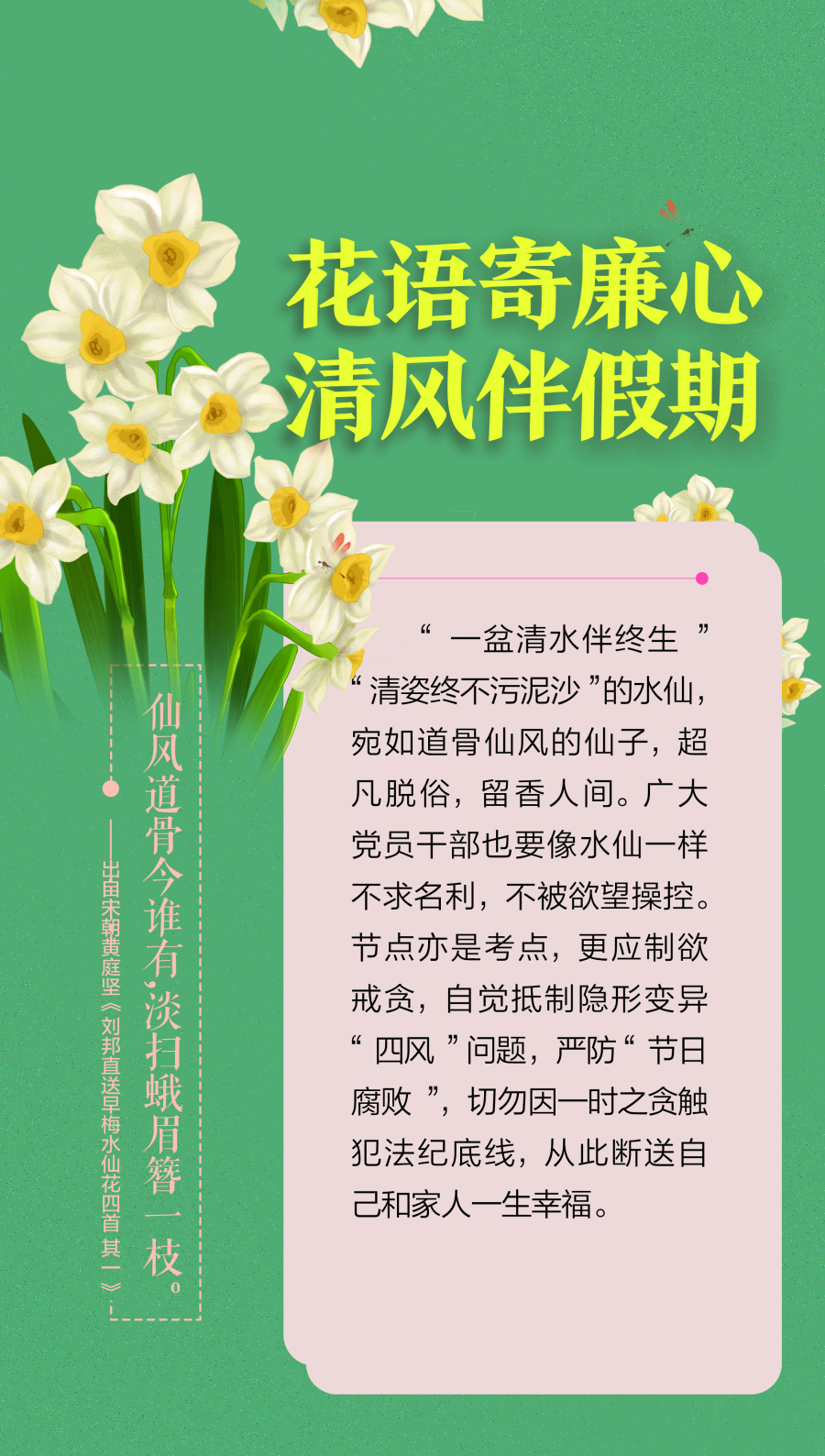 正所谓“一盆清水伴终生”“清姿终不污泥沙”,广大党员干部也要像水仙一样不求名利,不被欲望操控,要知道“贪如火,不遏则自焚;欲如水,不遏则自溺”。