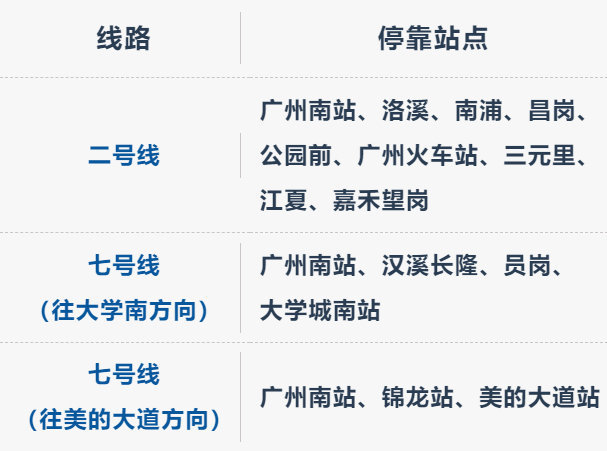 加开的快车,二号线停靠站点9个,包括:广州南站、洛溪、南浦、昌岗、公园前、广州火车站、三元里、江夏、嘉禾望岗。七号线广州南站往大学城南方向停靠站点:广州南站、汉溪长隆、员岗、大学城南站;广州南站往美的大道方向停靠站点:广州南站、锦龙站、美的大道站。
