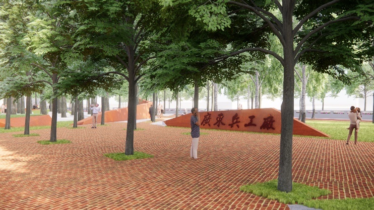 以兵工厂为中轴线,重新梳理场地功能及流线。中轴空间作为主要人群聚集的红色文化教育区;东西两侧则结合现场实地情况,合理置入活动节点,成为满足社区居民休闲的口袋花园。设计细致研究场地自身及兵工厂历史,溯源而上,通过文化展示的“红墙”,以“广州红色故事线”与“兵工厂技术发展线”的时间线叙事,延展出两条红色文化艺术化展示路径。同时提取兵工厂历史元素,结合红色文化印象应用在园路设计及铺装样式上,以“交汇”作为设计语言,通过硬朗的折线,红砖及耐候钢等材料,打造出红色文化新的交汇地。