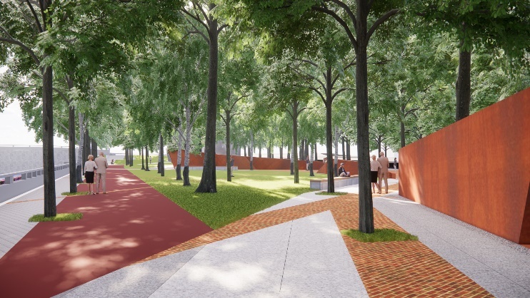 “如何将一个原来相对消极的绿地空间转变成有历史记忆和城市活力的开放空间,是这个设计的解题关键点。”AECOM景观设计执行总监吴琨说:“首先是空间关联,将场地作为兵工厂遗址的室外延伸,强化二者的联动属性。其次是历史关联,重新梳理两条历史时间线,将大众熟知的红色故事和鲜有耳闻的兵工厂技术发展史在空间上关联,形成我们的主要节点空间交汇草坪,真实的时空交汇使得两段故事的映照都将更加的生动。”