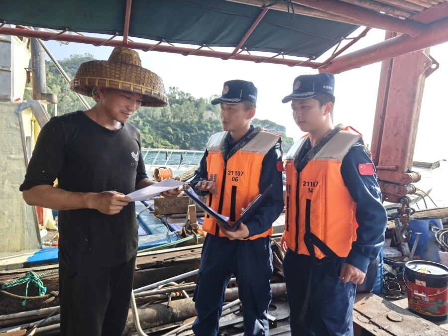 连日来,广东海警局执法员加强海上巡查力度,通过高音喇叭、广播等形式通报台风预警,引导渔船民及时回港避风。同时,执法员上码头、进鱼排,深入排查安全风险,讲授防台风知识,帮助渔船民检查设备仪器,转移物品物质,加固碰垫缆绳,全力以赴做好台风来临前的各项防范措施。
