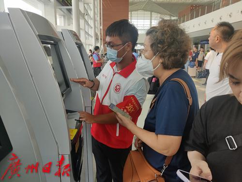 志愿者在广清城际花都站协助长者取票。