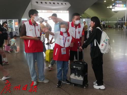 亲子家庭在广州南站为旅客指引。