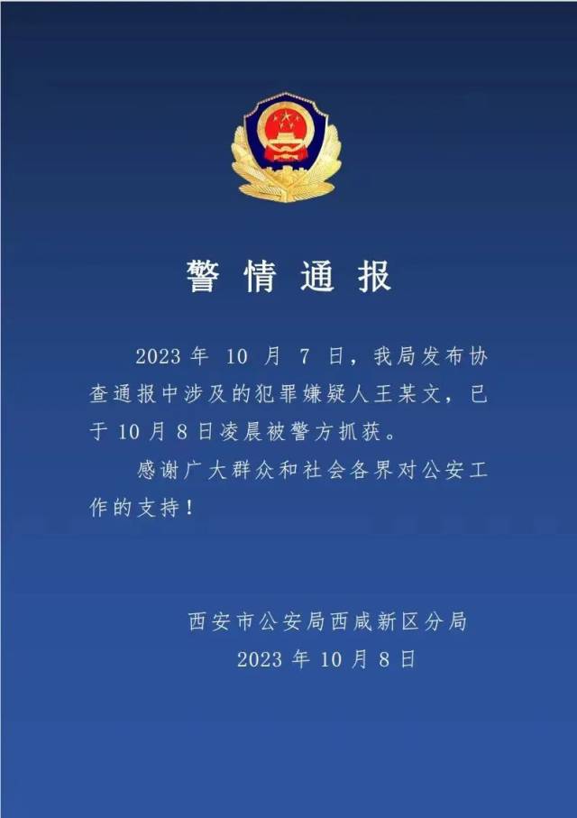 陕西省西安市公安局西咸新区分局官微通报,10月7日,该局发布协查通报中涉及的犯罪嫌疑人王某文,已于10月8日凌晨被警方抓获。