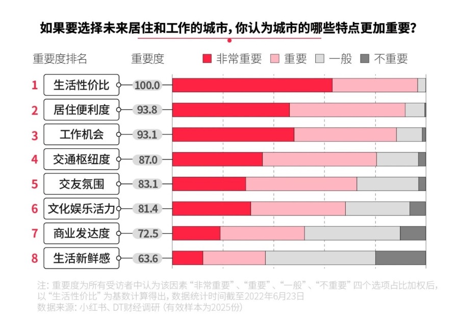 这份报告透露出年轻人对城市需求的变化。就业机会和商业发达程度只是衡量一个城市魅力的维度之一,年轻人还会有更多个性化的视角来考察一个城市的宜居指数。生活性价比、居住便利度、工作机会、交通枢纽度、交友氛围、文化娱乐活力、商业发达度、生活新鲜感成为年轻人最关注的八大因素。