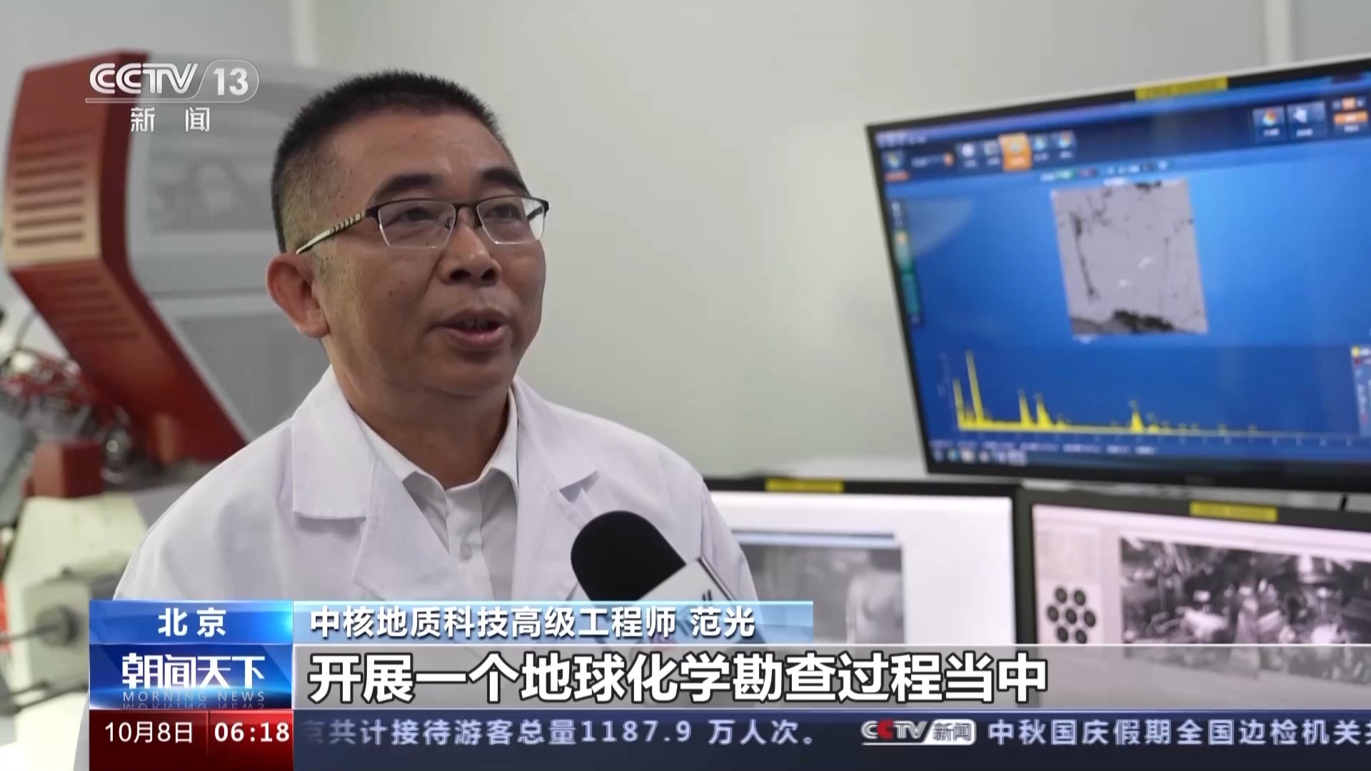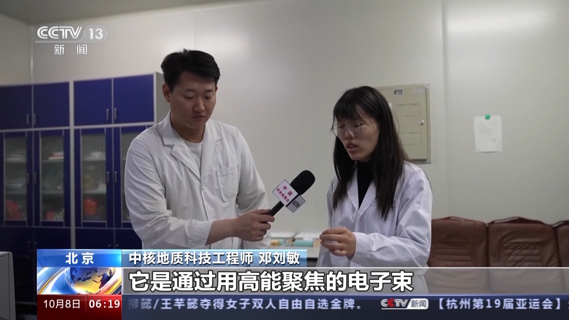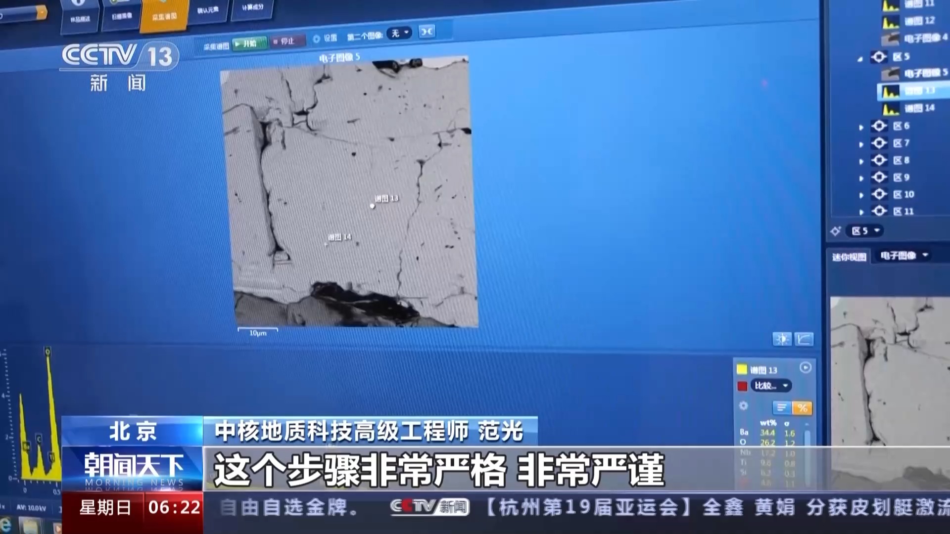 中核地质科技工程师 邓刘敏:它是通过用高能聚焦的电子束打到样品表面,测出它的各种元素的含量,可以通过这个元素的含量,确定它的化学式,从而确定它是不是新的,测定化学成分对于新矿物的研究也是比较关键的一步。