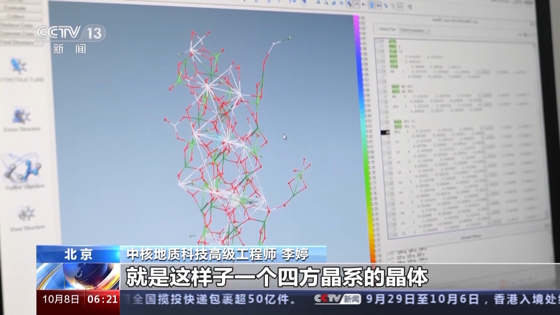 中核地质科技高级工程师 李婷:我们的颗粒会放在仪器的正中间,在样品座上。这边是光源(X射线),这边是接收器,当光(X射线)从晶体里面穿过被接收器接收的时候,它已经带了晶体的结构信息了。铌包头矿,我们最后解出来的它的结构就是一个四方晶系的晶体,这是原子之间彼此的排列方式。