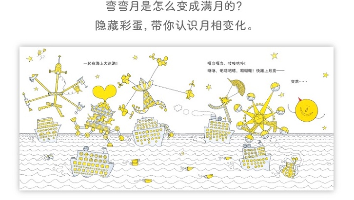 绘本中还展示了月亮的月相变化过程,比如:弯弯的月亮是如何变成满月的呢?知识融汇在有趣的绘画中,让孩子不知不觉就学到了知识。是一本既适合培养孩子观察力、启蒙天文知识,又适合作为睡前故事的绘本。