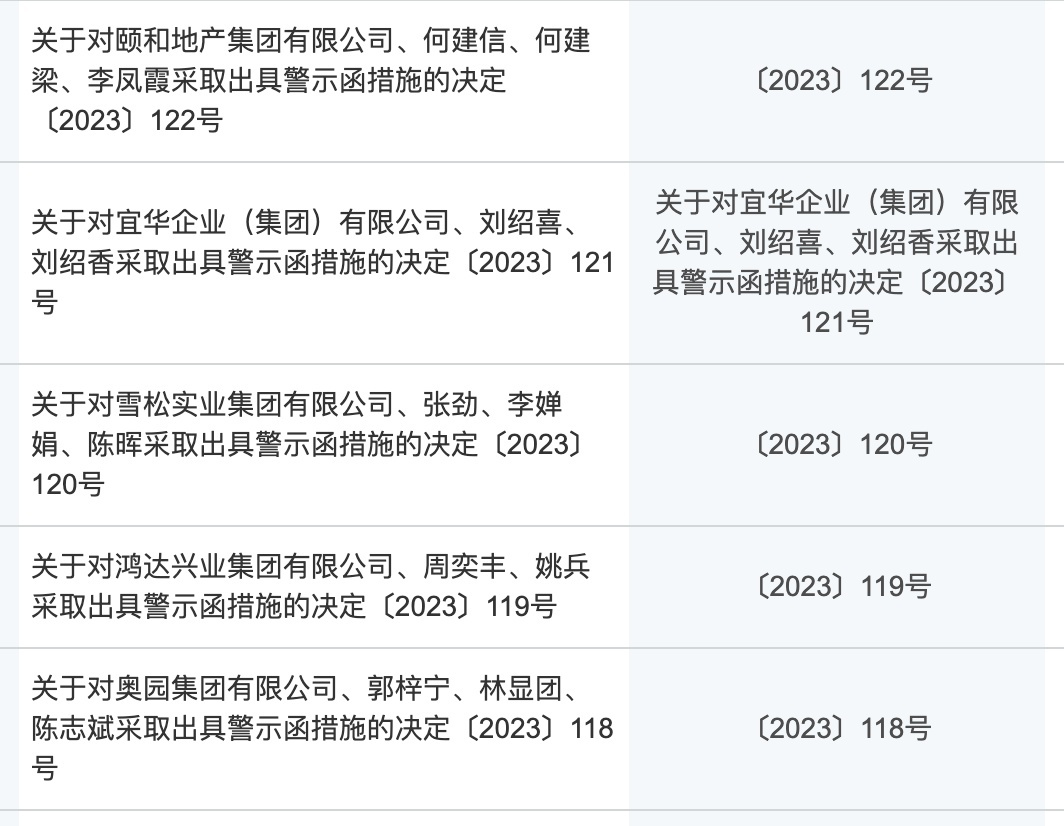 近日,广东证监局集中公布了多份行政监管措施决定书。主要对奥园集团、鸿达兴业集团、雪松实业集团、宜华企业、颐和地产等企业及相关责任人做出采取出具警示函措施的决定。主要原因是其作为公司债券发行人,未在规定期限内披露年度报告或半年度报告等。这一行为违反了《公司债券发行与交易管理办法》(证监会令第180号)第四条、第五十条、第五十一条第一款的规定。按照决定书,前述公司应于收到决定书30日内向广东证监局报送整改报告,并抄报上海证券交易所、深圳证券交易所。