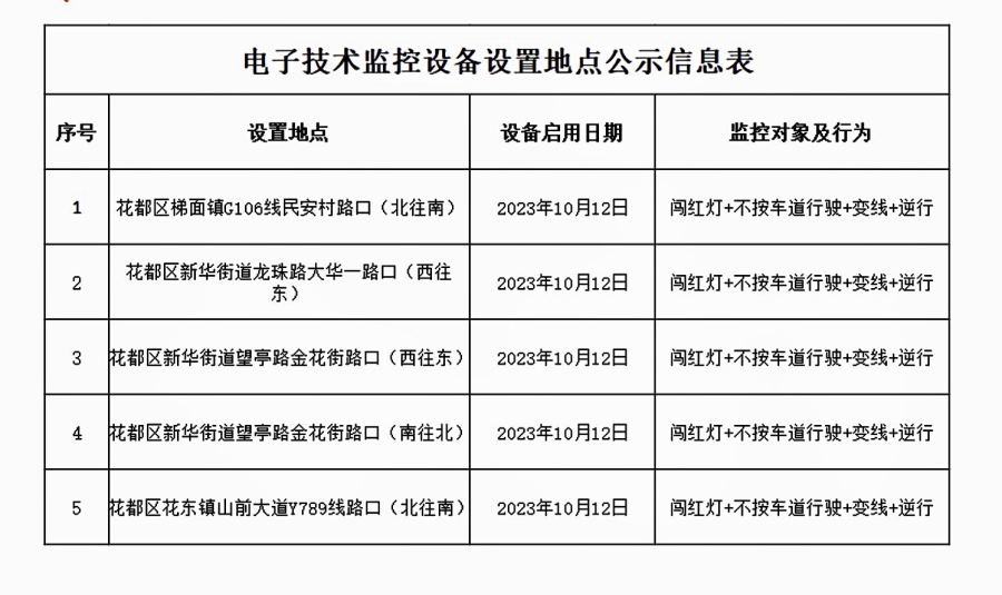 记者10月10日从广州花都警方获悉,为进一步做好城市道路交通安全管理工作,预防和减少道路交通事故,交警部门拟新增5套交通技术监控设备,计划在2023年10月12日启用。