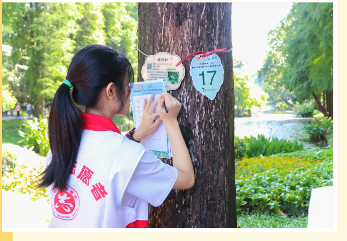 结对仪式结束后,中学生志愿者们分为六组,在专业志愿者的指导下分头开展“树木体检”志愿服务以及树木保护科普宣教志愿服务。他们手持调查表和树木胸径尺等专业工具,深入观察园区里宫粉紫荆、吊瓜树、细叶榕、落羽杉、凤凰木等12个树种,运用岗前培训学到的知识,认真细致地开展树木“体检”。
