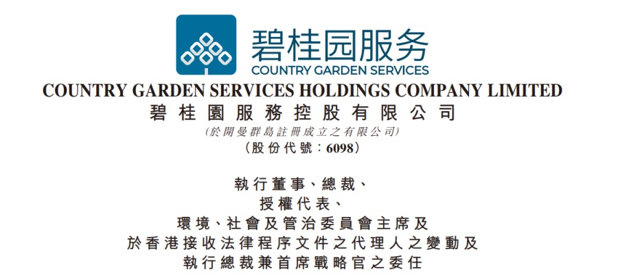 同日,碧桂园服务董事会还宣布,徐彬淮已获委任为公司执行董事、总裁、授权代表、环境、社会及管治委员会主席以及于香港接收法律程序文件之代理人,并于2023年10月10日起生效。据公告公开简历,今年44岁的徐彬淮于2016年10月至2023年10月先后获委任为公司副总裁、首席战略官,还分管战略规划、品牌、社区生活服务事业群、运营管理、数字化转型及智能制造业务。