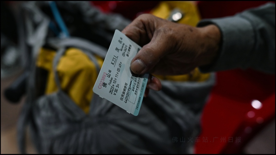 从进站大厅到候车大厅,装有折叠单车、重达50斤的行李让老谢累得气喘吁吁。他刚坐下,还来不及擦汗,便激动地从一个小包里掏出一张纸质的车票。“这张车票可珍贵了,我要一辈子保留下来”,老谢说,当他得知“佛山火车站暂停客运营业”后,特意到车站购买了一张前往茂名的车票,既是为了纪念,也是想来一次特别的体验。