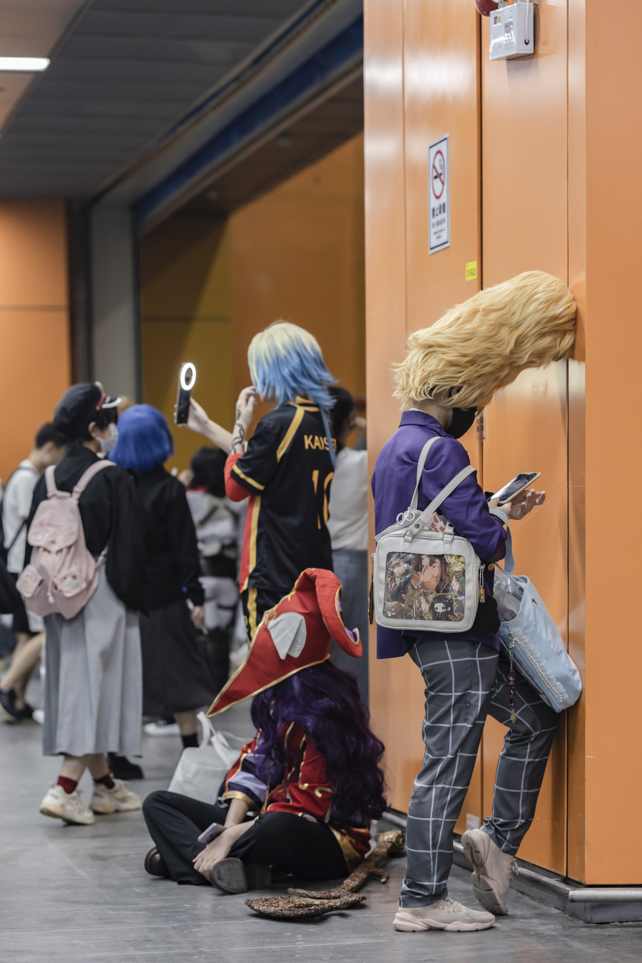 一场展览上,一位戴着夸张假发参展的Coser将头抵在墙上稍事休息,让路人忍俊不禁。