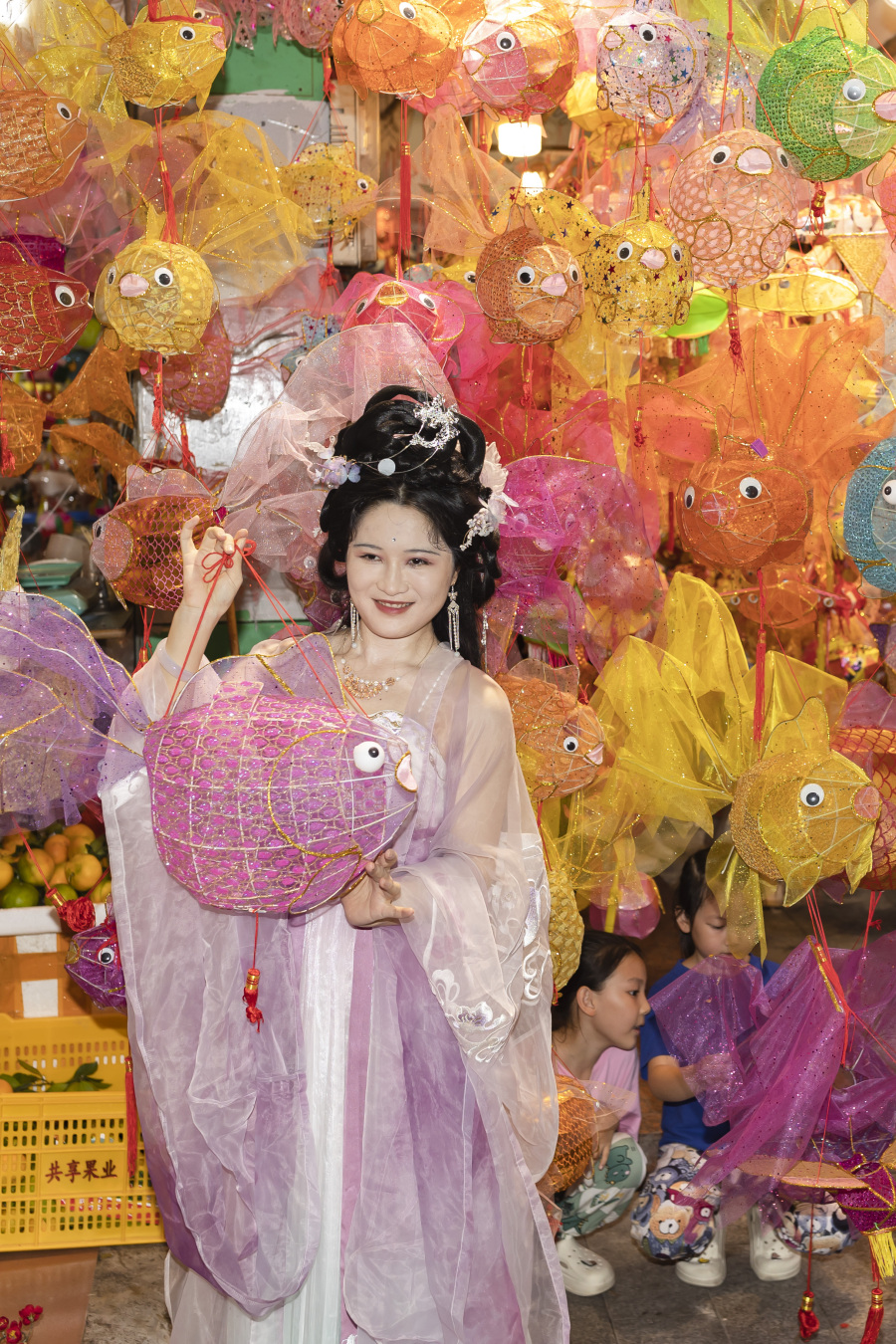 2023年9月16日,汉服爱好者欧小姐带着朋友一起来到光孝路拍摄中秋灯笼的照片。她当日穿的汉服是“霓裳蝶羽”。
