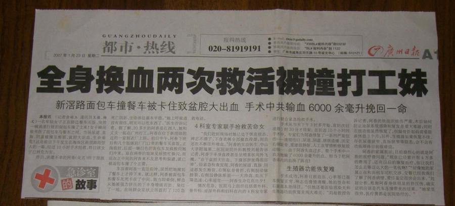 2007年1月23日,广州日报“急诊室的故事”专栏曾报道一位车祸伤者的遭遇:事发海珠区新滘路,年轻的外来务工人员阿香在路边餐车旁买午餐时,突然被一辆高速行驶的面包车从背后撞上,夹在了面包车与餐车之间,泌尿和生殖系统管道当场被撞至断裂,盆腔大出血,生命垂危!