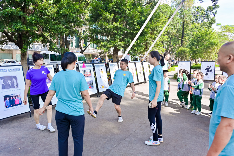 公园里总少不了市民踢毽子的画面。广州市南派花毽研究会的十多位老师今天一同登台献技,人毽合一,毽花飞扬,让人叹为观止。南派花毽一百八十式之单刀赴会、玉树临风、迎风摆柳......让现场观演的市民眼花缭乱。