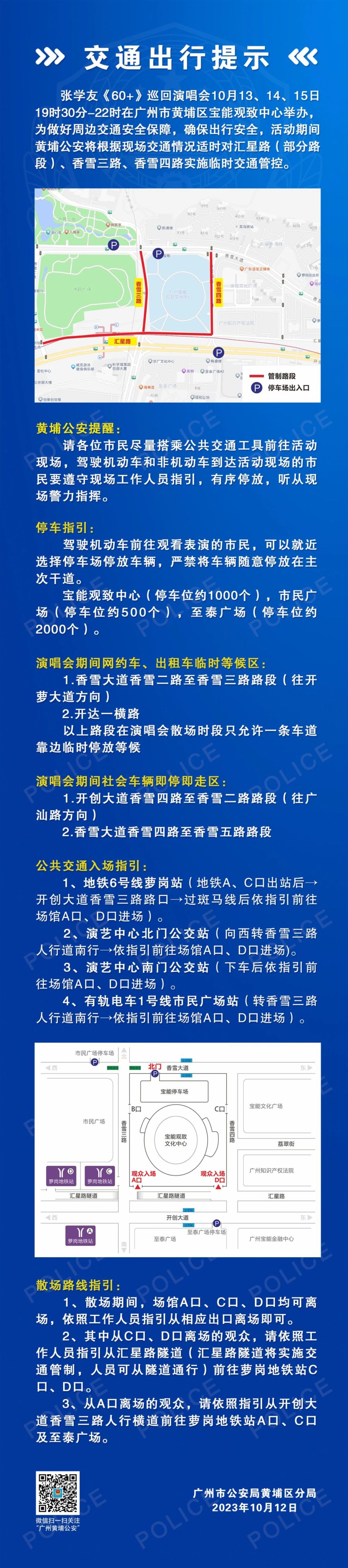 广州黄埔公安为10月13、14、15日19时30分-22时在广州市黄埔区宝能观致中心举办的张学友《60+》巡回演唱会发布交通出行提示。为做好周边交通安全保障,确保出行安全,活动期间黄埔公安将根据现场交通情况适时对汇星路(部分路段)、香雪三路、香雪四路实施临时交通管控。