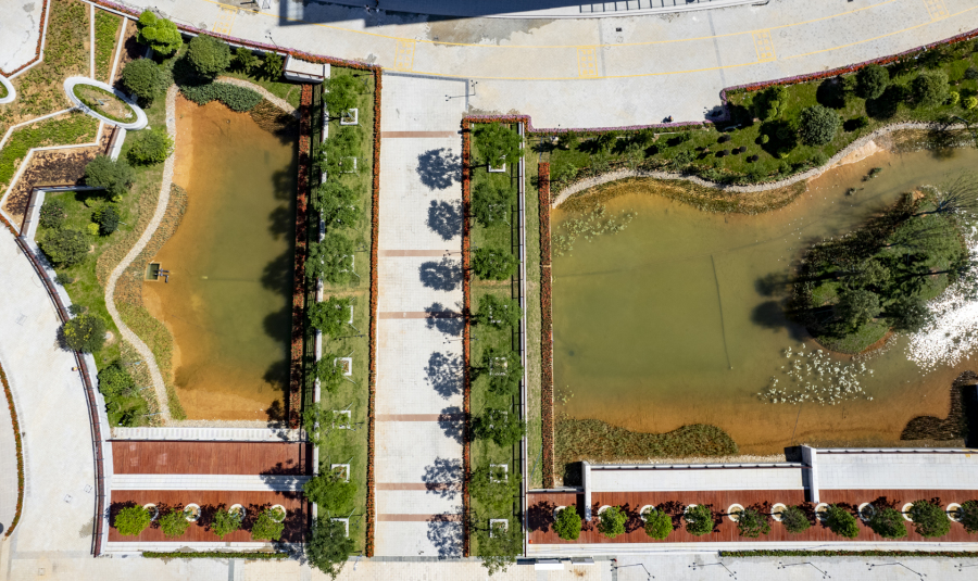 校区设计将现代职业技术教育与岭南、山水、人文、行业、低碳等五大元素相结合,布局“一核一轴”多组团结构,以行政办公楼、图书馆信息中心、多功能礼堂组成的综合体建筑为核心,通过中心休闲景观带串联高职生活区、实训楼区等多个功能组图。