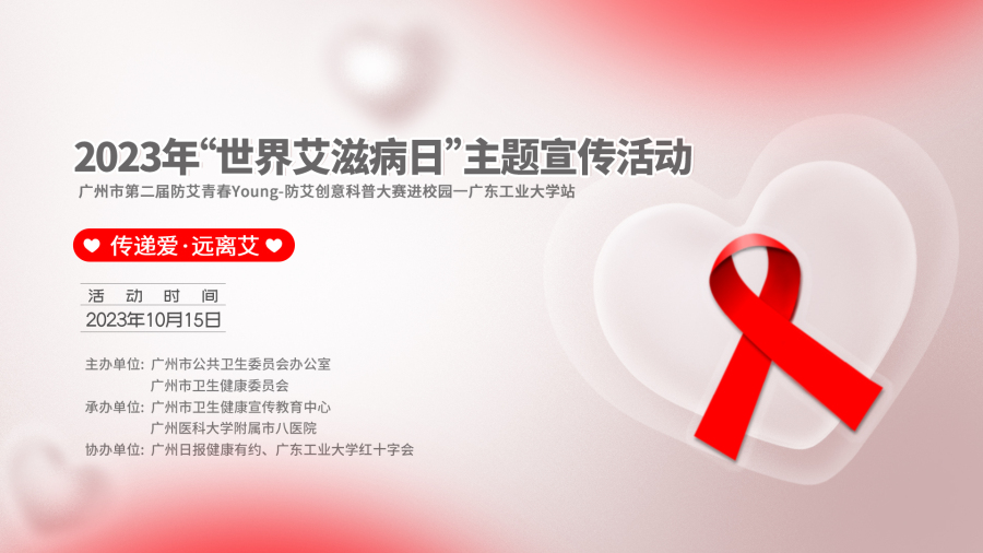 传递爱,远离艾!10月15日上午,2023年“世界艾滋病日”主题宣传活动暨广州市第二届防艾青春Young-防艾创意科普大赛将正式拉开帷幕。活动首站,我们在广东工业大学等你!