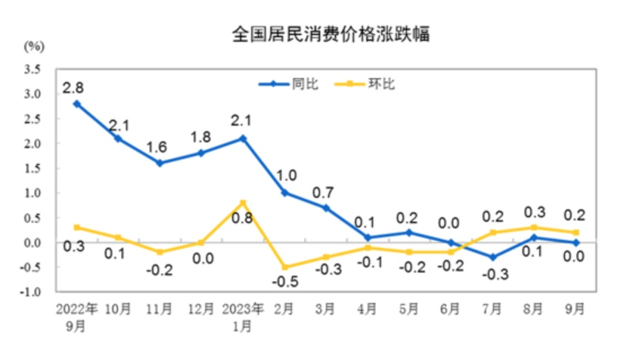 数据显示,9月份居民消费价格同比持平,环比上涨0.2%。国家统计局城市司首席统计师董莉娟解读称,9月份,消费市场持续恢复,CPI环比继续上涨,但受上年同期对比基数走高影响,同比由涨转平。