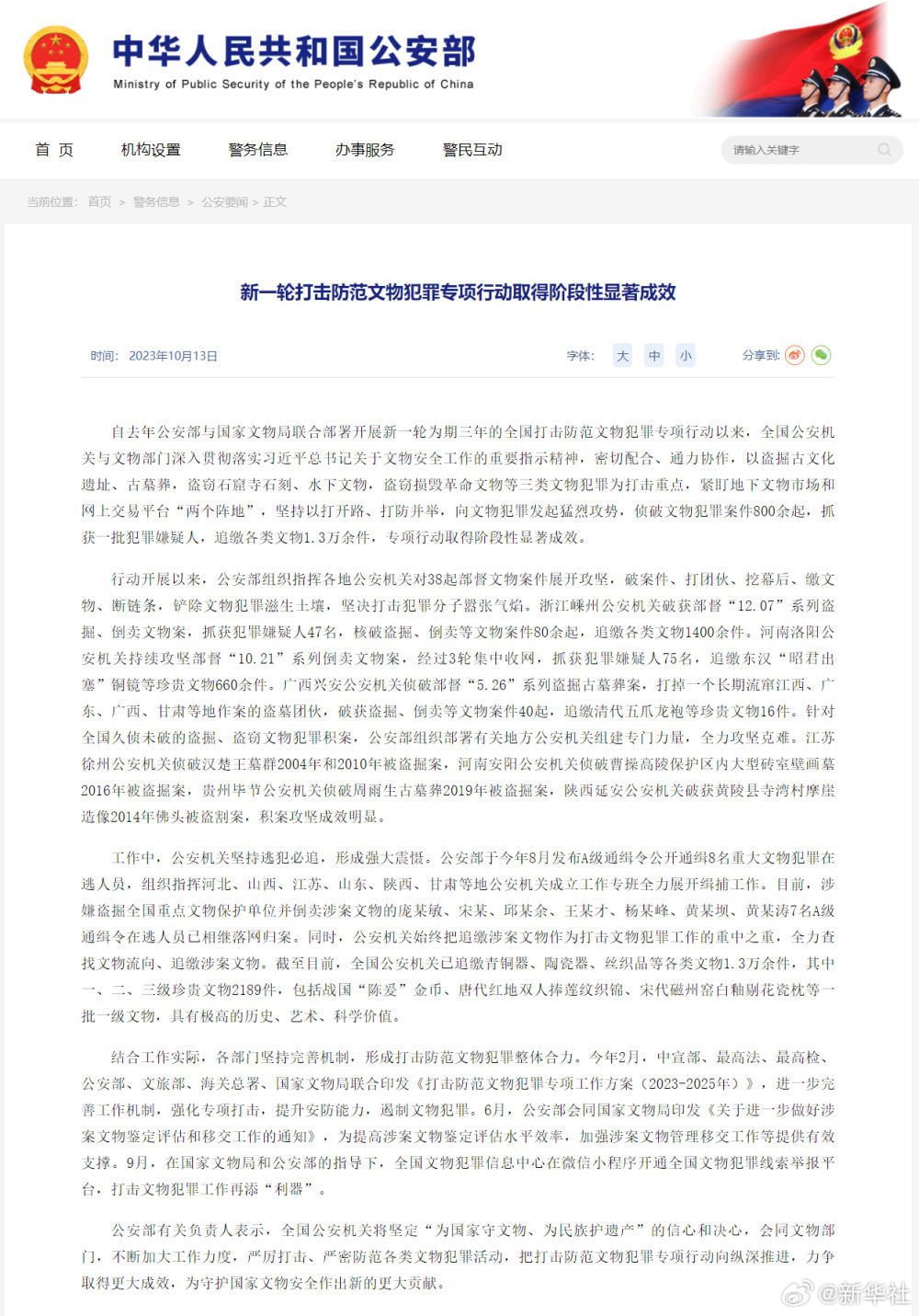 自去年公安部与国家文物局联合部署开展新一轮为期三年的全国打击防范文物犯罪专项行动以来,全国公安机关侦破文物犯罪案件800余起,抓获一批犯罪嫌疑人,追缴各类文物1.3万余件,其中一、二、三级珍贵文物2189件,包括战国“陈爰”金币、唐代红地双人捧莲纹织锦、宋代磁州窑白釉剔花瓷枕等一批一级文物,具有极高的历史、艺术、科学价值。专项行动取得阶段性显著成效。