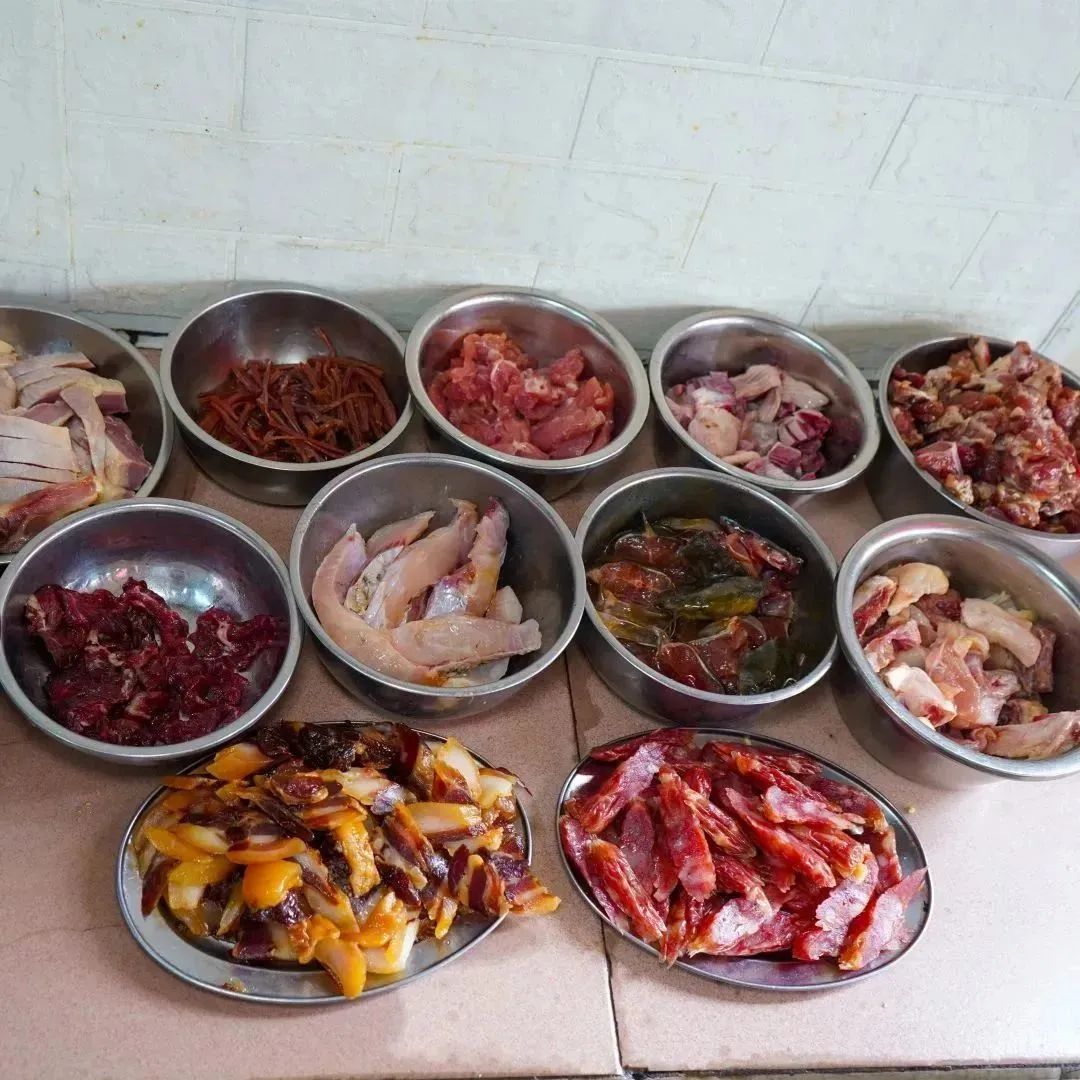 此外,这里的菜品种类也很有特色,除了常见的腊味、鸡肉、排骨等,还有平时少见的腊鸭肠、四川麻辣香肠以及店家自制的生晒鱼干等菜品。