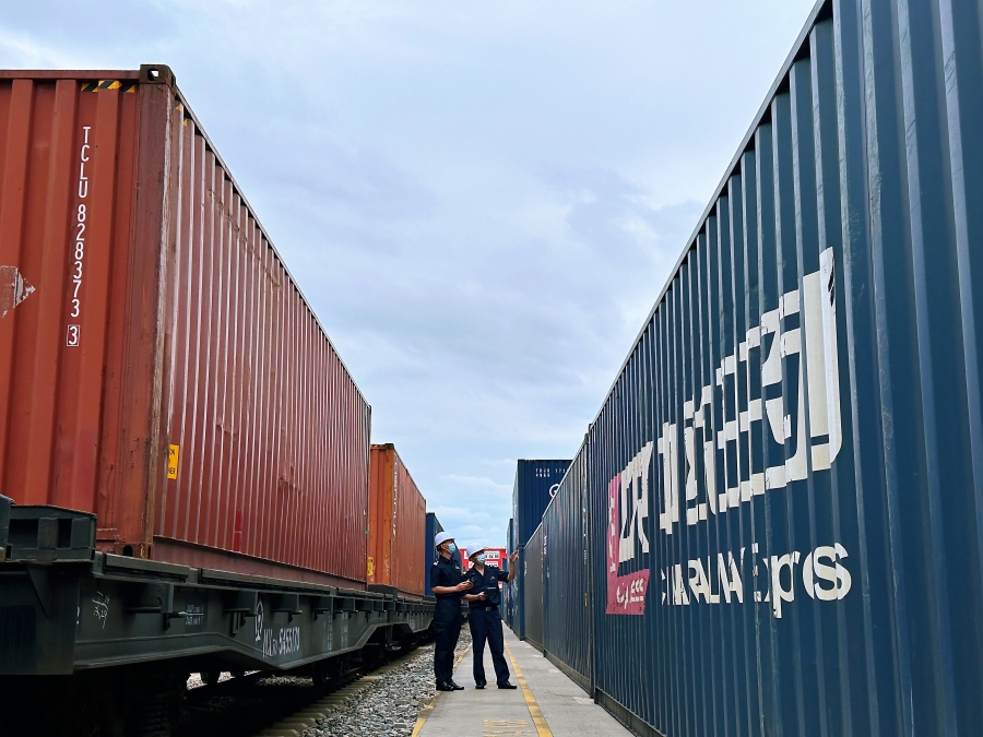 广州海关所属广州车站海关关员对中欧班列集装箱进行监管。