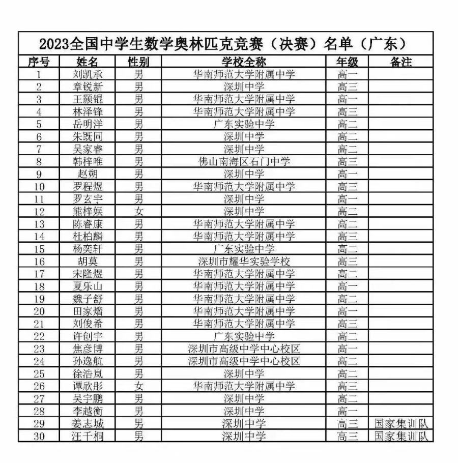 10月16日,中国数学会发布2023年全国高中数学联赛省一等奖及省队公示名单。广东共91人获得省一等奖,其中30人入选省队,即将征战国决!