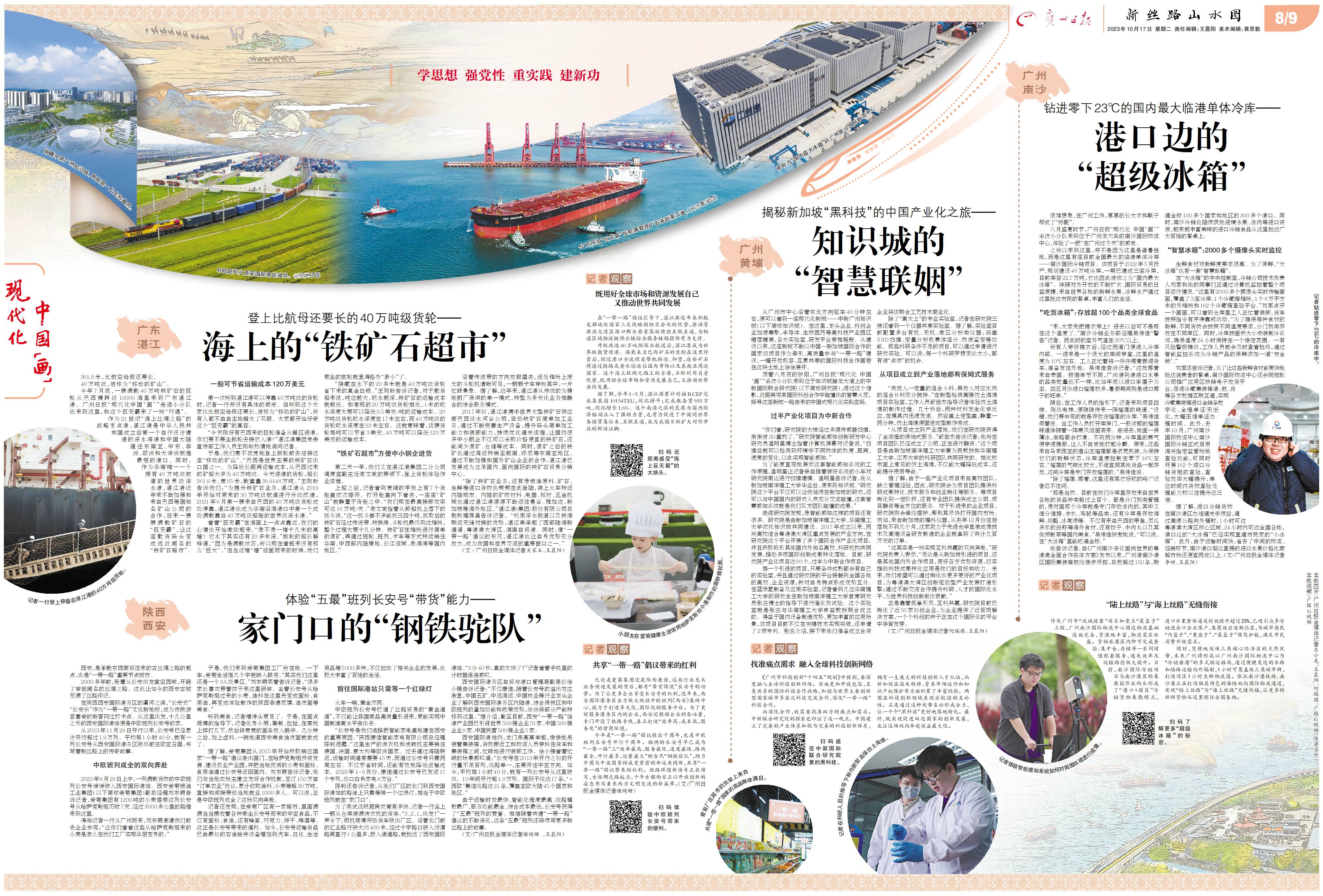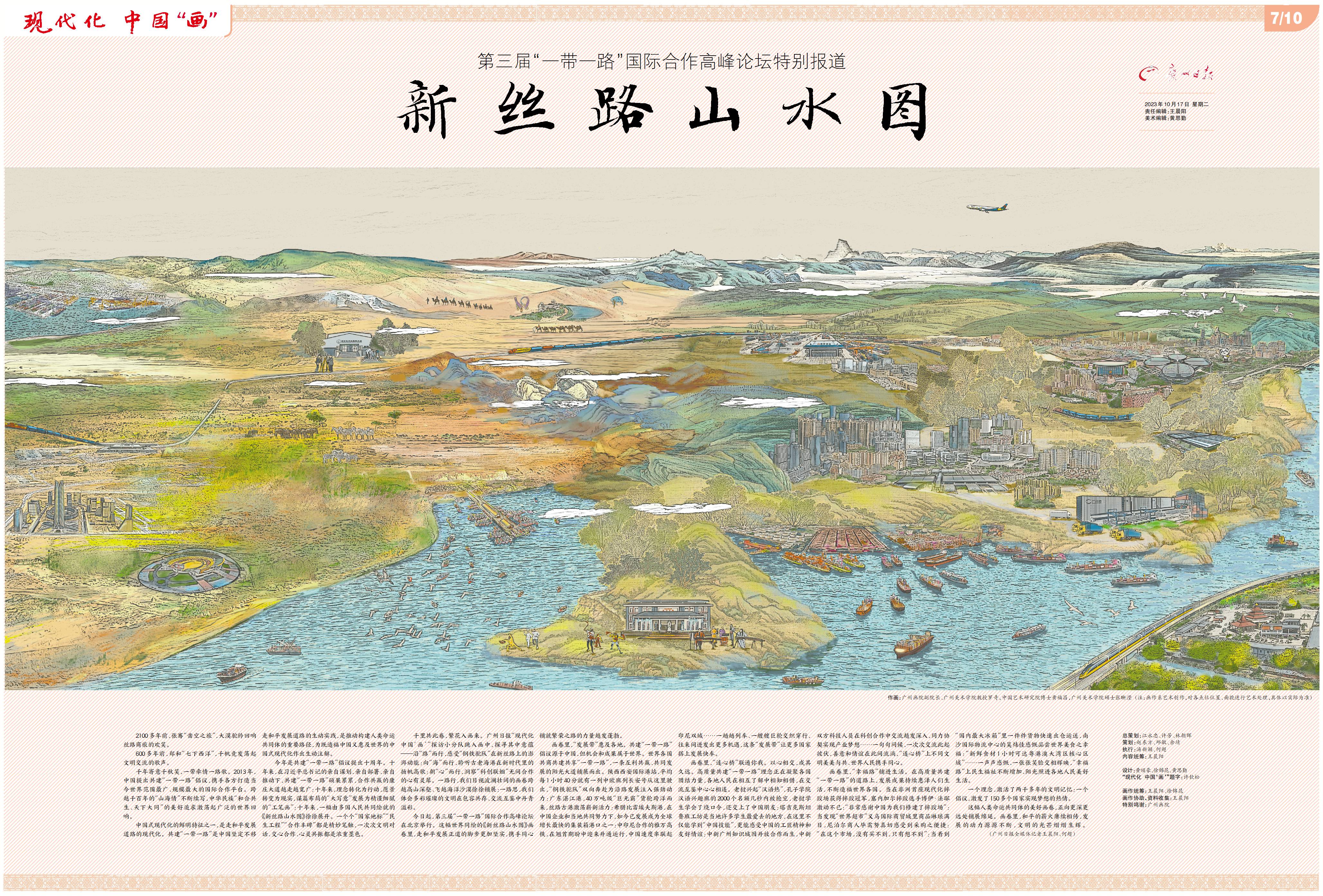 千里共此卷,繁花入画来。广州日报“现代化 中国‘画’”探访小分队跳入画中,探寻其中意蕴——沿“路”而行,感受“钢铁驼队”在新丝路上的澎湃动能;向“海”而行,聆听古老海港在新时代里的扬帆高歌;朝“心”而行,洞察“科创联姻”无间合作的心有灵犀。一路行,我们目视波澜壮阔的画卷跨越高山深壑、飞越海洋沙漠徐徐铺展;一路思,我们体会多彩璀璨的文明在包容共存、交流互鉴中丹青溢彩。