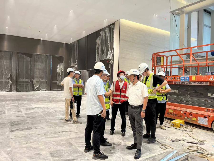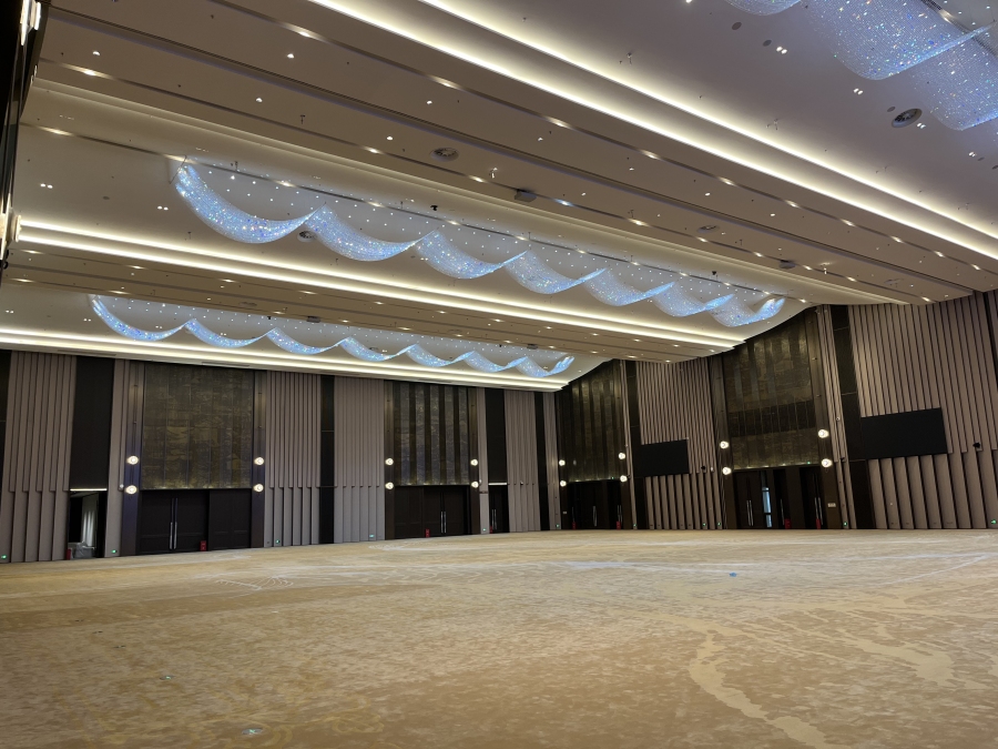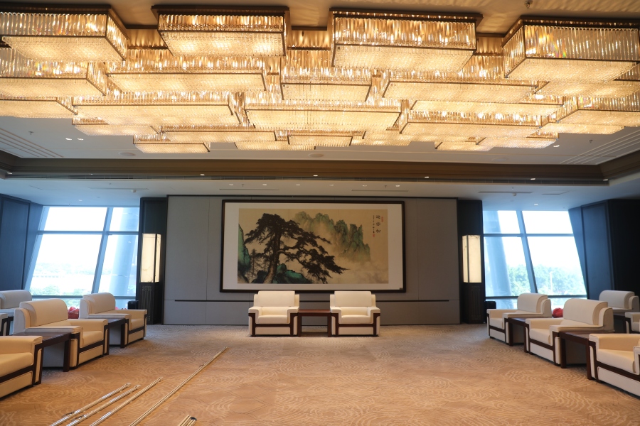 此次启用的会议中心将庄重大气的东方美学与端庄雅致的岭南神韵相融合,在装饰装修环节使用了中国青铜器、祥云、中国结、丝绸缎带等设计元素。在建设过程中,珠江监理针对国风装修要求,率先拟定了高规格装修质量标准。专门派人驻场监造,从源头出发,及时跟踪石材和木料等建筑材料上游管控,严格确保出厂物料质量、纹路款式和尺寸标准符合设计安装要求,攻克多功能宴会厅超高隔断屏风等施工难关。